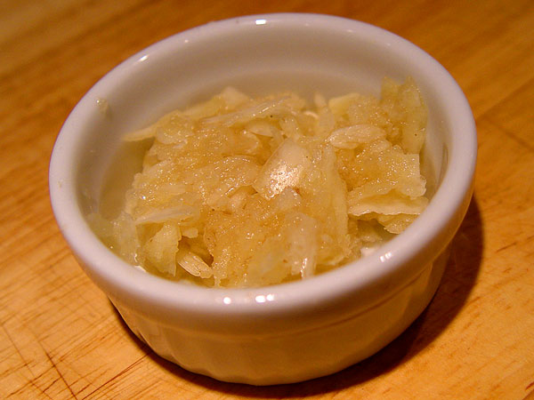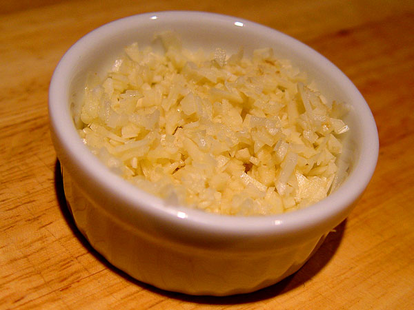 The minced was done by hand, the microplaned (obviously) done by microplane, and the crushed was done with a stone mortar and pestle.