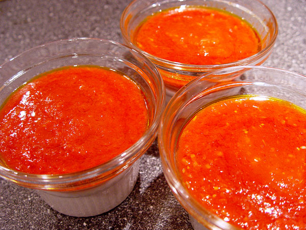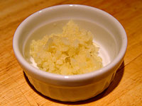 When all three sauces were prepared, they were allowed to sit at room temperature for ten minutes. After this time, they were placed atop ramekins containing a scrap of paper identifying the garlic preparation used for that sauce. They were then covered with plastic wrap and allowed to sit at room temperature for approximately one hour, to lessen the chance of the order of preparation affecting the flavor at the time of tasting. After sitting for an hour, the finished sauces were microwaved for ten seconds. This was to achieve two purposes, first to heat them slightly, and second so that the microwave turntable could randomize their placement, making it impossible for the taster to identify which sauce was which. The sauces were then tasted in sequence twice, to lessen the variation caused by tasting one sauce cleanly while tasting the others having come off another sauce. They were tasted in very low light conditions, to make it impossible for the taster to identify the sauces by the very slight variations in appearance. A small piece of plain bread was eaten in between each tasting to act as a palate cleanser. After the tasting was completed, the prep bowls were removed from the ramekins so that tasting notes could be matched up with the appropriate garlic preparations.