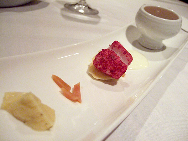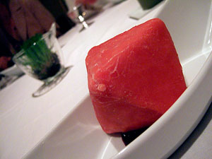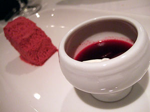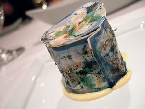 The first official course was an exact reproduction of one of the Iron Chef dishes. It was a "maki" of sushi rice, nori powder, golden beets and a healthy dose of miso mayonnaise, wrapped in edible paper printed with images of maki, which I believe officially makes this metamaki (that one's mine, Homaro!). It would make any Japanese traditionalist cringe (and even some non-traditionalists), but setting aside any preconceived notions of what maki should be, I enjoyed it a little more than I'd like to admit. It was exceptionally creamy and very sweet and had absolutely nothing to do with sushi bar simplicity and elegance whatsoever. I mean, I've been known to sometimes grumble about funki maki, but this takes the practice to an extreme. I knew I was being bought, but... well... I didn't mind. I could've pounded five or six of these, easy.