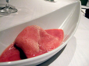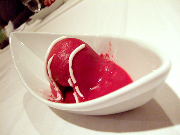 Where the first octahedron of beet melted away to reveal beet greens and bacon, the second octahedron of beet melted away to reveal... a sphere of beet! Also frozen, this inner beet geometry was yuzu-fied and maintained its icy texture while the outer octahedron melted around it to create the soup. Drizzled on top was the yogurt. At heart, the dish was far simpler than its presentation, but it was really very nice and refreshing... a great finale. Plus, it was good to finish with a lot of beet flavor, as the previous two desserts just barely hinted at the theme.