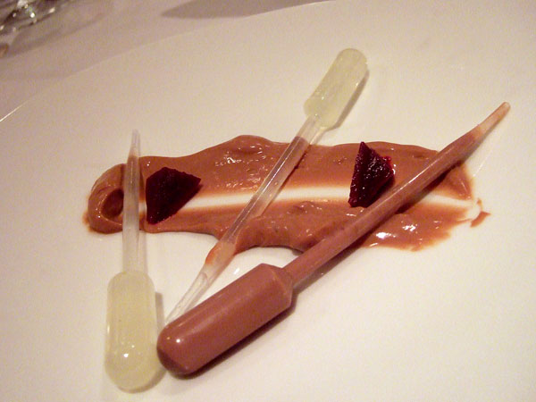 The first dessert was a smudge of barely sweetened chocolate mousse, with a couple bits of beet and three accompanying squirts... lemon, lime and chocolate. All of the sweetness was in the eyedroppers, so both elements definitely needed to work in concert. It was a tasty and fun dish, if unexceptional, and though I know the fellas over at Schwa are also working this combo right now, I'm still not sold on chocolate and beets as a pairing. I feel like they need something else to marry them. What that something is, I have no idea.