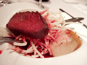In the end, while there were some very tasty items, I have to say that I expected more from an Iron Chef winning dinner. And like my first Moto experience, I felt that there were too many occasions when the food seemed to take a back seat to the wonky technique. Most notable, however, was the fact that I walked away still craving beets. Though beet was present in almost every dish, it was always transmogrified (to swipe one of Cantu's favorite terms) or presented only as a miniscule little segment of beet. This isn't to say that I didn't appreciate the more subtle uses or that I expected every plate to bowl me over with beetyness, but out of eight courses I felt as though I would have liked at least one dish with enough unadulterated beet for me to sink my teeth into. I think even one would have been enough for me to hang my hat on, so that I didn't feel unfulfilled. But we didn't get that chance.