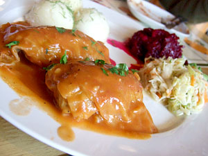 Less flashy, though perfectly enjoyable, was the "Grilled Sausage in Old Polish Style," which was as notable for its perfect preparation as for its flavor.  Looking at the photo, you can see... carefully scored, beautifully browned, taken right to the edge of being crisped too much... seems a small detail, but it made it particularly nice.  Served with potatoes and a huge pile of sauerkraut, it's a very enjoyable dish that I hesitate to recommend only because there are so many other routes I'd go first.  I felt similarly about the potato pancakes, which would have been notably good anywhere else, but got lost among other killer dishes.  The stuffed cabbage rolls, too, were tasty if not a standout dish.  Slathered in a light tomatoey sauce and filled with a moist, finely ground meat filling, they were surprisingly delicate.  Undoubtedly good, but not an attention-grabber for me in this company.  There's no denying the comfort factor, even if they didn't rock me.