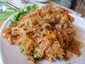 Rounding out the favorites was a dish that I've now had twice and am still trying to get my head around a little bit, partly because it wasn't at all what I expected.  Perhaps I bring too much baggage to the term "stew", but I think of a wet and meaty concoction that could be consumed with a fork, but which probably requires a spoon for all of the juicy, saucy stuff.  The hunter stew, however, isn't the least bit saucy.  It arrives as a huge pile of cabbage, seasoned and cooked with small chunks of diced veal, sausage and potato.  It almost has a bit of a sauerkraut vibe, but just barely.  There's some sourness, but this isn't a pungent dish.  Rather, it comes across as smoky and deeply flavored, more of a bold vegetable dish with meat than a meat dish (though the meat is present, and in abundance).  It was unexpected, unlike any dish I'd previously tasted, and I found it very, very compelling.