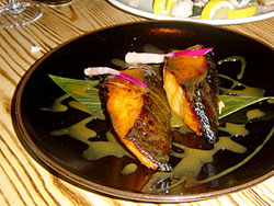 This one's fairly traditional, and as such acts as something of an anchor for round one. The tuna is very lightly seared and topped with a sweet ponzu, scallions and ginger. Where it departs a bit from tradition is in punching up the garlic, both in the sauce itself and in a thin slice of garlic on each piece of fish. When the fish is on, this dish rocks. Of course, this is Nobu, so the fish is always on. |