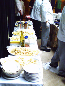Over at the carved meats station, there were enormous lamb shoulders that were apparently subjected to volcanic heat for weeks to ensure that they were well-well-reallywell-done and bone dry right down to the core. The ham had clearly been sitting in a saline bath since last Easter. The pasta bar... good god, the pasta bar... nothing makes my heart cry like enormous piles of cold, par-cooked pasta... your choice of shape... waiting to be tossed in a skillet for a few seconds with a couple ladlefuls of marinara or alfredo sauce. And the crowning touch... "a microepidemiologist's dream", as my doctorwife put it... a huge pile of the nastiest, greyest, slimiest, sludgiest most deadly-looking raw oysters I've ever seen. They didn't even bother with the pretense of ice, almost as if to say, "go on... we dare you." A five pound sack of iocaine powder could only dream of the killing potential of that pile of ex-bivalves. I saw a woman walking by with a huge plateful of them and quietly hummed Taps to myself.