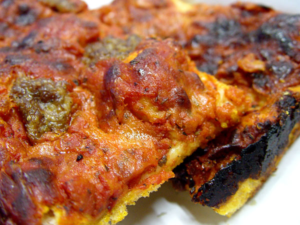D'Amato's makes an Italian-style sheet pizza, cooked in a large rectangular pan and cut into 8x6" pieces. It's an intensely-flavored slice, and its awesomeness knows no bounds. Unlike