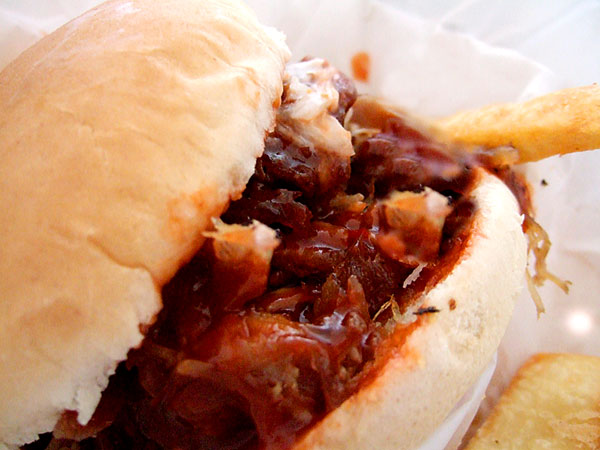 As for the sauce, there are many who believe that pulled pork should always be Carolina-style, with copious vinegar. Though I also dig the ΓΌber-tart variant, I'm not among those who consider anything else to be a travesty, and this sandwich is a perfect example why. Honey 1's sauce is bold and rounded, with a good balance of tart, sweet and spicy. Though the exact composition is a closely held secret (Adams has only revealed that it contains honey... natch), it's been rumored that Open Pit is the starting point. While this seems plausible, if true, the commercial product only acts as a springboard for greater things. It's a great complement to the pork, and it's applied sparingly, so that it doesn't overwhelm the meat. The sandwich is finished off with a bit of creamy cole slaw. This seemed like a risky move, but it worked for me. There was very little used, but the little hint of cool creaminess mellowed the edge of more aggressive smoke and spice flavors just a bit.