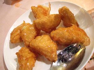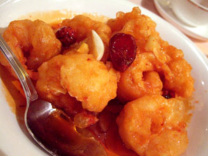 Another favorite appetizer is their Sliced Pork in Garlic and Chili Sauce. It's a small pile of very tender, moist slices of carpaccio-thin cooked and chilled pork, swimming in a sweet and slightly spicy oil with heavy soy, garlic and sesame components. It's a bold and succulent dish that challenges the western notion that all Chinese dishes are stir-fried, deep fried or steamed. From there we usually move on to one of my favorite dishes anywhere, their Deep-Fried Prawns in Sweet-Sour and Chili Sauce. It's a sweet-sour that demonstrates the folly of the goopy, ketchupy glop that's frequently found on chunks of lean pork loin in the States. The sauce is a very light syrup with some characteristics that almost resemble a liqueur. It's potent, and it swings more towards the sour end of the spectrum, then punches you with the aromatic trio of chili, garlic and ginger all at once. It's almost like a Thai dish in its explosiveness, and it's at or near the top of my list of restaurant dishes I'd like to reverse-engineer.
