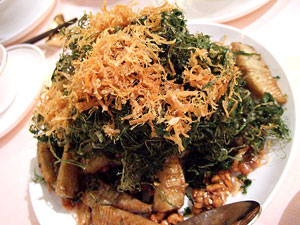 Of course, if it isn't a law that all Peking-style restaurants must do a phenomenal Peking Duck, it should be. But in any case, these folks are in compliance. It's a no-frills preparation that doesn't go through the extra steps of creating stir-fry and soup and what have you from the rest of the carcass, but instead focuses on the essence of Peking Duck, which is the crispy, fatty, lacquered skin. You have the option of receiving your bounty either in sliced form, with a little strip of skin along the edge of each slice of meat, or the way I prefer it, as seen here, skin and meat separate. With the latter, you're more able to get a good mouthful of the incredible skin, which obviously makes it the correct choice. Another of our favorites is something the likes of which I've never seen in the States. Their Deep Fried Crispy Shredded Conpoy, Walnut, Bamboo Shoot and Salt Cabbage is, I suspect, not what the USDA has in mind for the fruits and vegetables section of their venerated pyramid. But surely, if they were aware of such a dish, an exception would be made for its exceptional taste. It's a dish that's as much about texture as flavor, though the latter is certainly no slouch. The entire dish is fried, and as such is rather crispy, though each component is crispy in a different fashion. The cabbage and bamboo are both heavily salted, and the