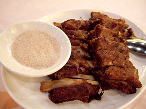 For me, a Chinese meal isn't complete without big chunks of pork, and the Spiced Fried Spareribs are another favorite. Coming from the United States, you'd be forgiven for thinking this was the first time you'd ever tasted real pork, largely because you'd be right, but that's another rant for another day. Here, the ribs are coated with some type of dry spice blend and deep-fried, then sliced and served with a fine seasoned salt for dipping. The meat is both minimal and delicious. The seasoning is present, but plays only a small, unobtrusive supporting role. This is pork with character. The outside isn't a dense, tough chew like American BBQ, but is instead very light and crispy. The meat inside is tender, but it offers resistance. The meat falls from the bone, but to consume it requires a certain amount of immensely pleasureable chewing. Being very lean, it's in stark contrast to the ultrafatty Chinese pork that I've come to adore, but even in this state it has more pork flavor than almost anything I get stateside. Given the texture, I'm quite certain it's cooked before it hits the deep fryer, but I have no idea what form this par-cooking takes.