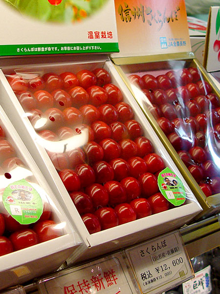 No, it's not an exaggeration. Of course, it should be obvious that not all Japanese produce is so expensive. Generally speaking, everyday produce seems a little pricey, but not unreasonably so, and given the tradeoff in quality, I'm inclined to believe that it's worth every penny. But premium fruit is another beast entirely. These fruits are bred to be the apotheosis of fruity goodness, and meticulously tended as they grow. They're sold at the peak of their ripeness, ornately packaged with more care than the average newborn child, and sold at a price that reflects the amount of care they've been given. The result is absolute perfection. Of course, the prices reflect the quality. $200 for a gift melon isn't the least bit unusual. The cherries you see pictured below sell for over $100 per box... more than $1 per cherry. Insanity? It would seem so. Until you taste some.
