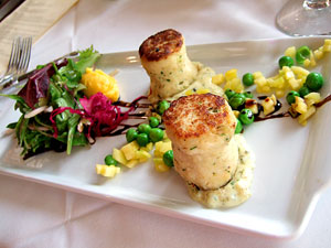 For an appetizer, I figured I'd better try the crabcakes. They were beautifully plated, with fresh peas and mango, a tartare-ish sauce and balsamic reduction, light salad and a mango sorbet... all elements that we've seen together before, but skillfully balanced and playfully arranged. The crabcakes themselves were a touch on the mushy side (something I probably wouldn't have minded before this January's