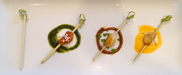A common Italian pasta technique that I find absolutely maddening is that they will frequently cook whole garlic cloves in olive oil, and then throw them away before using the oil for the pasta. The upside is that when I cook huge pots of pasta for Movie & Pasta Night, I end up with a little cup of tender, crispy, delicious whole garlic cloves to munch on. Such are the chef's spoils, but with this dish I wanted to share. Each of the three cloves was sautéed and then seasoned: basil puree with pecorino, anchovy puree with fresh mint and red pepper and chile puree with Sichuan pepper. Of course, the presentation on the aforementioned 1000th dish, served to the chairman, was slightly different.