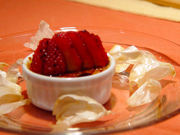 Roasted Garlic Crème Brûlée with Strawberries and Balsamic Syrup