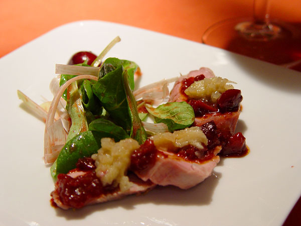 Cherry was another finalist for the secret ingredient, and I think garlic and cherry is a great pairing, so I wanted to do a dish that incorporated two garlic and cherry pairings, one cooked and one raw. The pork tenderloin was marinated with cider vinegar, thyme, bay leaf, cumin, allspice, cloves and cinnamon. It was roasted and topped with a sauce composed of butter, shallots, whiskey, cherries, thyme, ancho chiles and garlic confit, which was made by blanching garlic cloves before poaching them in duck fat. The pork was accompanied by a salad of maché and slivered green garlic, dressed with a vinaigrette of oil, cherry juice and sherry vinegar.