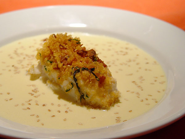 Fried Garlic Crusted Halibut with Pickled Garlic-Miso Sauce
