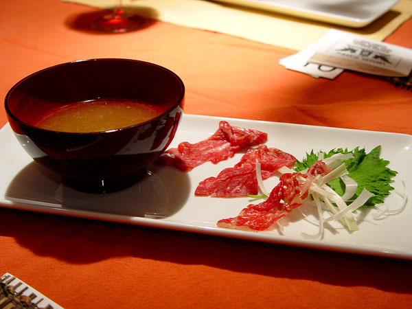 Garlic soup is done frequently enough, but it's usually done as a heavy, creamy monstrosity. So I wanted to do a garlic soup that would bring out a lot of garlic flavor without beating the judges over the head. I thought a beef stock would be the best vehicle, so the soup was comprised of a homemade beef stock made with marrow bones, beef chuck, onions, ginger, fish sauce, sugar and lots of garlic. The soup was accompanied by thin slices of raw Wagyu beef and slivered green garlic, which were dipped into the broth to be lightly cooked and eaten while drinking the soup.