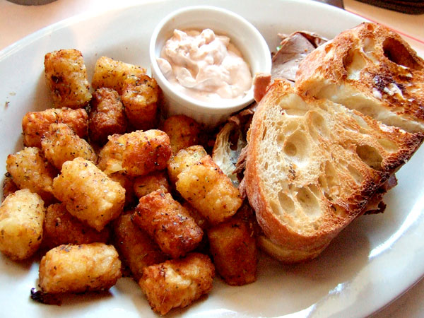 For my sandwich, I went with the roast beef. This was a dish that, for me, could have been really nice, but was torpedoed by what were either mistakes in execution or in planning. The sandwich was on a very nice toasted crusty bread, with some leeks and roasted tomatoes, and was accompanied by a tasty sauce that, to my surprise and delight, was sour cream based insted of mayonnaise based. The problem, however, was that the house made roast beef was well-done to the core, tough, rubbery and largely tasteless. The flavor was less roasted with care on the premises and more institutional packaged beef. The sandwich also came with tater tots. I love tater tots. And for their little classy twist, they were dressed with a dried herb mixture that I thought was really delightful. But they were either baked, or first fried and later baked, and either way had clearly been sitting away from the most recent heat source for quite some time. They were also tough and chewy. In my book, when it comes to fried potatoes, if they aren't going to be served fresh from the fat, you're better off simply going with some other side rather than trying to hold them for extended periods of time.