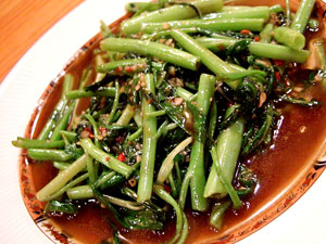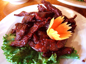 The next one down is a dish that brought back memories of China. Spoon's phàk bûng fai daeng, aka water spinach with fermented yellow bean sauce, was indicative of the kind of greens that are so hard to find in the States. The water spinach had an intense green flavor, but was still fresh, light and crispy. Whenever somebody mentions, in stereotypical fashion, that kids don't like greens, I think to myself that it's only because they don't get greens like this. Below the water spinach is Spoon's néua tàet dìaw, frequently referred to as a Thai-style beef jerky, though that's grossly misleading. They're both made from cow, and are dry, but the similarities end there. This dish is somehow marinated and dry fried, resulting in intensely flavored bits of beef that are crispy on the outside and pleasantly dry and chewy through and through, but still fresh.