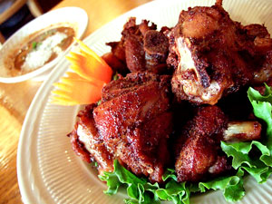 Finally, here you see Spoon's plaa sôm. This one isn't actually on the menu, so I'm going to show it here just to torture you. Unquestionably, one of the best dishes of the lot. Its preparation is something that I find fascinating, but I can see how some might find it... disturbing. The fish is crisply fried and served with a spicy, tart dipping sauce, but most impressive is the fact that there's a wonderful sour flavor that completely permeates the flesh. This is achieved by gutting the whole fish, stuffing it with rice, and allowing the rice to ferment inside the fish for a few days. There are those who are disturbed by anything that is intentionally left to get a little funky, but bear in mind that fish sauce... arguably the cornerstone of both Thai and Vietnamese cuisine... is most commonly made by putting salted fish in earthenware jars in the sun for about a