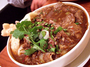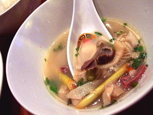 At both restaurants, we had kài thâwt, fried chicken that was heavily marinated, fried crisp on the outside but juicy on the inside, and served with a tamarind dipping sauce. I've often joked that it takes a lot to get me excited about chicken, but this was some exciting chicken. Though both were delicious, Spoon Thai's version was really something special, and it's pictured at the top of the page. Moving down the page is one of two fantastic soups we had at TAC Quick, tôm sâep, an Issan-style soup with little bits of beef offal. It was extremely tart and a little spicy, but what impressed me was that it packed a wallop without sacrificing subtlety. As potent as the flavors were, they were balanced and rounded, and the broth remained extremely light and refreshing. As for the offal, I have no idea what bits I was eating, but they were tasty.