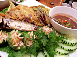 The next dish down is Spoon's yam hèt khẽm thawng, a typically Thai sweet, sour and spicy salad made primarily of enoki mushrooms and topped with a sprinkling of rice powder. As Thai salads go, the mushrooms were new to me, and they made for a really nice textural change of pace. The next one down is TAC Quick's náam phrík kà-pì plaa thuu. This is another dish we had at both restaurants, but here I preferred TAC's version. It's grilled mackerel, egg crepes and assorted crudites, served with a gnarly, spicy dip made with fermented shrimp. It was a huge winner for me, perhaps because the fermented shrimp reminded me of the Italian anchovy concoctions that I've come to love so dearly. It was spicy, fermented and sour, very complex and