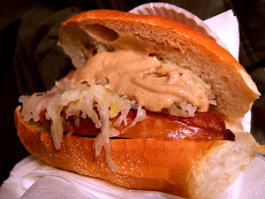 As mentioned, unlike many other permanent "farmers' markets", the West Side Market focuses on purveyors of raw goods rather than eating establishments, but there certainly are a few of the latter. There was a Middle Eastern sandwich stand that I understand is quite excellent, though I didn't have a chance to sample, myself. Johnny Hot Dog sells exactly what you'd expect, as does Steve's Gyro, and tucked away in a corner is Kim Se, which sells assorted Southeast Asian dishes. On this particular day, however, it was Frank's Bratwurst that got its hooks into me, much to my benefit. It was just a lightly seasoned, juicy sausage on a fresh hard roll with a simple sauerkraut and spicy mustard, but it absolutely hit the spot and seemed more than appropriate to the surroundings. Apparently I wasn't the only one who thought so. As I walked the market with my bounty, I was stopped by no fewer than three other marketgoers who wanted to know the source. With my face full, I was reduced to a simple grunt and point, but I think the message got through.