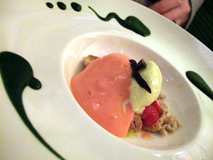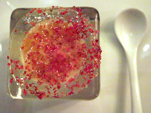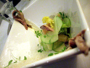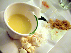 With our third dish, the folks at Schwa sang a little ode to their neighborhood. They called this dish their elote soup, which is a wonderfully descriptive title if you're familiar with the Mexican vendors who roam the surrounding streets selling boiled or grilled ears of corn, slathered in margarine or mayonnaise and sprinkled with chili powder. The dish captured both the flavors and the casual feel of the eloteros' carts. It was a simple but smoothly sweet, velvety corn soup in a cup rimmed with a cilantro puree. On the plate were salty popcorn kernels, some shredded cheese, grilled fresh corn kernels, mayonnaise, a touch of chili powder and a dollop of an intensely sweet and sour lime reduction. The fun presentation, intentionally or not, also served a worthy purpose. It's impossible to compose a bite that incorporates all of the elements, so you're forced to take a bite here, a swig there, pop a kernel here, dip in the lime reduction there... and as a result, every bite has the same flavor profile, but features a different element of the dish. Eating the dish was like listening to a song while futzing with the graphic equalizer, maxing out a different band every few seconds. It was a little goofy, anti-highbrow, and very enjoyable.