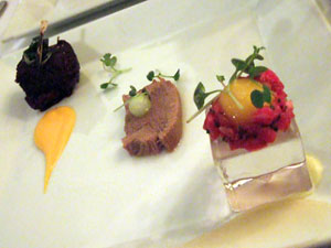 beef flavor at its purest, tender but potent. My favorite of the three. Last up was braised short rib, extremely dark, caramelized and very, very salty with a heavy soy sauce seasoning and a light and almost creamy sweet potato puree accompaniment. I thought the seasoning was almost a little too aggressive on the meat, but I dug it nonetheless, and I thought the pairing was a very nice one.