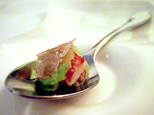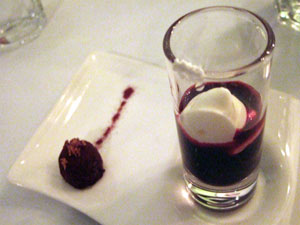 In lieu of a traditional cheese course, Carlson instead chose to serve a spoon filled with a cheese risotto. The cheese in question was Morbier, a somewhat pungent cow's milk cheese with ash veins. It was accompanied by a summer savory puree and some paper thin dehydrated apple slices that were crumbled over the top. I thought it was a delightful alternative to a traditional cheese course. The risotto was quite toothsome which, combined with the crispy apple, made for a nice textural contrast to the inherent creaminess of the Morbier. It could be argued that it was nothing more than a repackaging, but I thought it was a delicious repackaging that wasn't the least bit gratuitous. There's a part of me that would've enjoyed a full bowl, but that part of me was shouted down by the part of me that thinks palate fatigue would set in about midway through. One bite is just right.