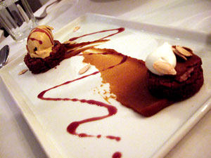 We were each served a dessert, and we switched midway through. The first was another sweet/savory crossover that worked olives into a sweet context. The base of the dish was a crumbled olive bread that I thought almost resembled a scone. This was topped by some olive oil ice cream, a strawberry cream, basil puree and little bits of crispy candied olive. I thought it was spot on. It absolutely stayed in the dessert realm, but the olive components added just enough savory funkiness to keep it edgy and interesting. And it was delicious! Again, the disparate flavors didn't blend so much as they happily coexisted. Made me happy, anyway.