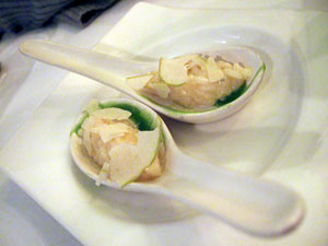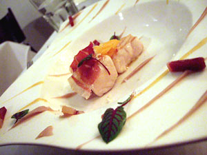 Next up was another excellent salad. This time, it was composed of marinated white anchovies, thinly sliced green apples, celery and batons of braised celery root, a green apple and olive oil puree and a pile of wispy microplaned Manchego cheese. Also, as with the caramelized fennel puree from our last visit, he grounded the salad and gave it an earthy dimension by adding a celery root puree that lined one side of the bowl. It's an approach I love. While salads tend to be either/or affairs that hit one end of the light/earthy spectrum, the two Carlson salads I've had thus far cover the full continuum. This isn't easy to do. There isn't much challenge in throwing together a bunch of light, sweet fruits or a pile of starchy root vegetables, but to marry the two is tricky, especially when you're throwing in some piscine pungency to boot. It was a really tasty little number that reflected what I'm starting to see as Carlson's style -- unusual combinations of disparate flavors that complement each other without getting lost in one another.