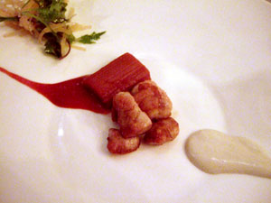 Next up was the other duplicate dish, the crispy sweetbreads with wine-braised rhubarb and Humboldt Fog goat cheese. Having written about this dish before, I won't go into full detail again, but I did make two observations this time around. First, like the ravioli, this was even better on our second visit. The sweetbreads were crisper, the flavors were sharper... it just felt like these guys were really hitting their stride and getting every minute detail just right. Secondly, while eating the dish this time I started thinking about the fact that when it comes to organ meats, chefs often go to great lengths to eliminate or lessen some of the more intense organ-ey flavors and smells, usually by soaking the organs in milk or through some other form of pre-treatment. The thought occurred to me that the funky, intense Humboldt Fog bleu was almost like the right hand "look over here" maneuver, distracting from any pungency that might be left in the beast. This may or may not have been intentional, but I got a chuckle out of it either way. And if I was being fooled, I was more than happy to play along.