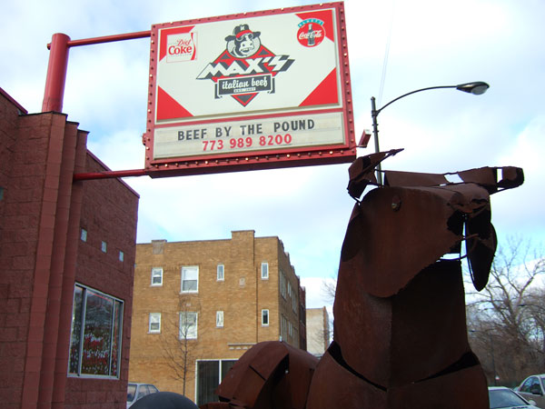 For the final chapter in the Beef-Off, we swing way up north to Max's. Appearance-wise, Max's is one of the more colorful locales. A rather chipper looking cow in shades adorns the sign out front (further bolstering my theory that all of my foodstuffs are positively thrilled to be eaten by me), and he's surrounded by a small herd of welded metal minions. The interior walls are adorned with murals of the city, there are five or six tables plus enough counter space and stools to seat 20-30 in cozy fashion, and a couple of televisions that I suspect are usually tuned to something sports related. It's a pretty extensive menu, with the beef and beef-related items only composing a small section.