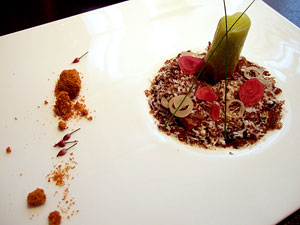 Alinea - Chicago Alinea was a fantastic experience that I hope to duplicate sometime soon. Achatz' dishes engage the brain without working at the gut's expense. Whether the bison or squab would be the one to make the top ten was a tough decision, but I finally settled on the bison. Not only was it a religious culinary experience, but it was one of the shining examples of unorthodox technique creating compelling new dishes. The bison was first treated three ways... smoked, poached, then grilled... and then combined with a spicy raisin sauce. It was accompanied by gently cooked leeks, and a number of dehydrated ingredients including gruyère cheese, tiny flakes of pumpernickel bread and a powdered caraway salt. Not only was the flavor phenomenal, but the integration of the dehydrated and powdered ingredients created a wonderfully unexpected textural angle. Fantastic dish. | ||||