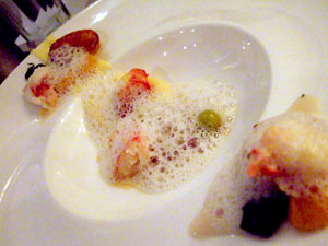 Schwa - Chicago It's just chance that this one came up first, I swear. I also swore I wouldn't do any kind of rankings. But this was my favorite dish of the year, hands-down, no question. Despite plowing through hordes of high-end cuisine for the Summer of Fine Dining, I only encountered one dish in 2006 that was giggleworthy. Michael Carlson's lobster dish made me absolutely giddy. As I said in the first Schwa post, "the dish contained chunks of butter-poached lobster, sitting on a potato puree and accompanied by slices of roasted fingerling potatoes, some Swiss chard, gooseberries and a lavender foam. The combination was the kind of bold, pure, intense flavor that creates a total sensory overload. I think I left my body for a minute or two. A dish this intoxicating is a rare, rare treat." Carlson's quail egg ravioli may be the dish that causes most to swoon, and with good reason. But as fantastic as the ravioli was, it was this lobster dish that I'll never forget. | ||||