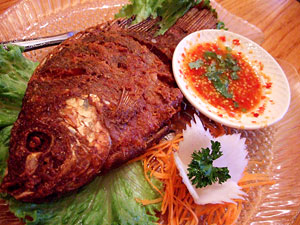 Spoon Thai - Chicago I almost feel guilty putting this one up here, since it isn't actually available. A few months back, I had the great fortune of being invited to a Thai feast by the inimitable Erik M. of silapaahaan.com. Erik, being good friends with the folks who run Spoon Thai, arranged a special menu that included some dishes that aren't ordinarily on the menu. This one was my favorite, not just for its awesomeness, but also for the fact that it was prepared in a manner that was wonderfully novel to me, no matter how traditional it may be in reality. Sticky rice is fermented in the cavity of the fish before it's deep-fried, imparting it with a wonderful mellow sourness that completely permeates the flesh. It was an eye-opening year for me when it comes to traditional Thai, and this dish was one of the highlights. | ||||