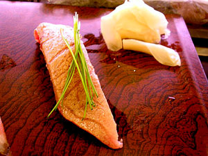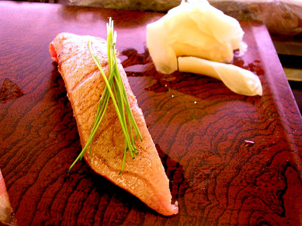 Sushizanmai - Tokyo, Japan I've been to Japan a number of times and demolished more than my fair share of raw fish. But on my trip this past April, I hit a new high. Searching online for all-night sushi bars, I came across Sushizanmai, which has a number of locations around Tokyo. The one I hit was just a couple of blocks from Tsukiji, the largest fish market in the world. Raw fish doesn't get much better than this, and while everything was phenomenal, there was one item I tried that absolutely blew me away. I saw the chef preparing it for another customer, and asked him to make some for me as well. Aburi toro is, like any other toro, the extremely fatty cut of tuna taken from the belly of the fish. But in the case of aburi toro, it's then topped with a light dusting of some mystery powder that is both salty and sweet, quickly seared with a blowtorch, and topped with a bit of chive. It. Was. Amazing. The quick sear under incredible heat leaves the inner rawness while cooking the outer surface. But most importantly, it melts and draws out some of the fat, leaving the surface of the fish glistening with pure toro richness. I've never had it anywhere else, so for all I know this is incredibly common in Japan. But I can't imagine it getting any better than what I had. Food just doesn't get any better than that. Tragically, I didn't get a photo of this one, but Eduardo Seidenberger came to the rescue, graciously sending me his photo of aburi toro for me to post... and from the same restaurant, no less! | ||||