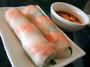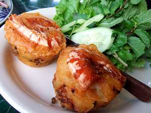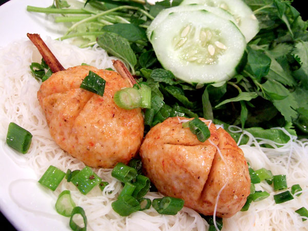 Next up, pictured above, is one of my favorite Vietnamese dishes, chao tom... lovingly referred to in our household as shrimp pops. A thick paste is first made from shrimp, shallots, garlic, pork fat and some other seasonings. This paste is then formed around sugarcane and grilled. It brings to mind my old favorite, the