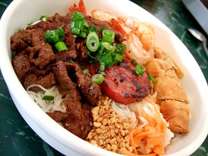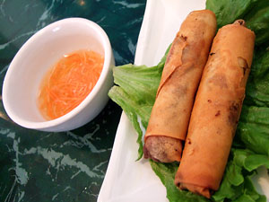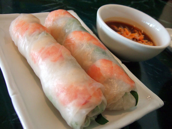 The appetizers include a number of spring roll variations, both fresh and fried. We tried the most basic of each, the cha gio (fried egg rolls) and goi cuon (fresh spring rolls). The fried rolls are served with lettuce leaves for wrapping, and an extremely light, fresh sweet & sour fish sauce for dipping. There are endless variations out there, traditional and otherwise, on fried spring rolls, but this is my favorite way to have them. The sauce isn't overly potent and cloying, so it doesn't bury the flavor of the roll, and wrapping the roll in a fresh lettuce leaf takes an otherwise heavy dish and makes it light and refreshing. The fresh spring rolls are also straight-up traditional, with rice vermicelli, fresh herbs, shrimp, sprouts, a couple of other vegetables and, in Tank's case, a bit of pork. They're served with a chilled peanut sauce that's smooth and slightly sweet. Simple and delicious, both.