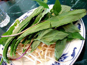 The mystery herb pictured is culantro, a/k/a saw tooth herb, a/k/a ngo gai. It's recao in Puerto Rico, and is the basic ingredient in the Puerto Rican mother-condiment recaito (a recao sofrito, basically). Cubans and Dominicans use it, too, though less. I'm often asked by the Cuban in-laws to pick some up on Argyle, as the Viet places are the best source for fresh culantro. It's the proper herb in black bens, though cilantro is more commonly used.