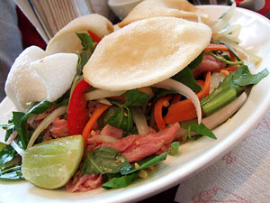 We had a couple of spectacular salads as well. The first is bun bo nuong, which comes in a number of varieties that vary some of the toppings. They're all served on a base of chilled rice vermicelli with some lettuce, cucumber, carrot, bean sprouts and mint, and they come with a lightly tart and sweet "lemon fish sauce" for dressing. The version you see here includes grilled beef and shrimp, chopped peanuts, a fried egg roll (same as the appetizer, I believe) and a slice of grilled sausage. Everything is simple and delicious, but the sausage was a surprise. It's some powerful stuff, fairly tart and very garlicky. I understand it's made in-house, and it's really delicious. The dish mixes cold and hot, tart and sweet, moist and dry... all wonderfully balanced. I've had "Vietnamese Rice Noodle Salads" elsewhere that were inspired by this dish, but they have a tendency to get far too heavy and overpowering... more like noodles swimming in sweet sour sauce. I know I sound like a broken record, but Tank keeps this dish very simple, light and refreshing. When it's 90ยบ and muggy, this will be at or near the top of my list of perfect hot weather meals.