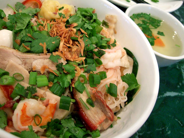 Of course, there's some more wintry fare as well. One that sounded quite promising but ended up being my singular disappointment was the hu tieu kho dac biet. It's billed as a "special" rice noodle soup, and by special I can only assume they mean all-encompassing. A very mild broth is served on the side (I suspect so that it can be seasoned before being added to the noodles, though if anybody with more Vietnamese experience can confirm, I'd love to know for sure), and the noodles are topped with so many little tastes I can't even remember them all. There was cooked shrimp, barbecued pork, cooked chicken, a couple different dumplings, pork meatball, a salted quail egg, crab meat, cucumbers, herbs, fried shallots and a few other items I'm forgetting. There's a certain novelty to the little taste of everything under the sun approach, but unlike the other dishes we had that incorporated multiple elements, I didn't feel that these worked together. It may very well be intended as more of a sampler and less of a cohesive dish, but it just didn't appeal to me.