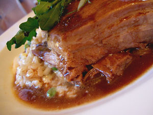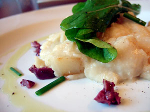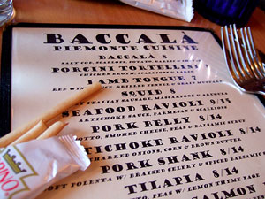 Enter Baccalà: my opportunity to approach Bubala in his new environs with a clean slate. Apparently he's been traveling Italy quite a bit, evidenced not only by Thyme's metamorphosis and his subsequent decision to open a second Italian establishment, but also by the scads of Bubala's photographs that adorn the walls of Baccalà; taken, I understand, by his own hand. It's a comfortable, cozy, inviting little room of wood and brick, and the menu matches. Though there are a couple of pastas to be found, the menu is primarily composed of heartier fare with emphasis on pork. I thought the menu was nicely structured, composed a third of appetizers, a third of entrees, and a third of dishes that can go either way by request. As it turned out, this was almost a matter of necessity. The three dishes we tried were... well... read on.