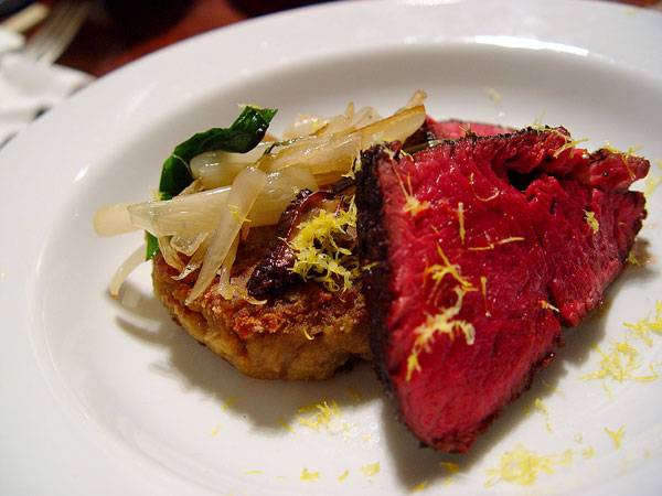 Pictured here sans consommé, which was added tableside. This was the snake bitten dish. This was the one I knew was going to absolutely rock, and then the wheels came off. Still, a very good dish that I was absolutely happy with, but not what it could have been. First, the veal tenderloins I'd special ordered from a usually excellent butcher and brought home the day before were absolutely rank and brown almost to the core when I unwrapped them at 5:00 PM. After receiving my panicked phone call, the fellow graciously offered to stay past closing until I (or my designated lackey) could get there to trade out the problematic meat, but the veal tenderloins were a specially procured item and not available. In their place, he sent us a stunning beef tenderloin. Not my first choice, but not a bad substitute by any means. Then, I discovered that all of my mussels had kicked the bucket overnight, and that one just about killed me. The mussels were the key. They were to be steamed in the consommé to provide the unusual twist that was going to take the dish from good to awesome. Faithful sous Kirsten ran about town trying to procure more, but to no avail. We went without. Still I can't complain too much. We crusted the beef with very finely ground dried porcinis, and seared and roasted it. The risotto was made with fresh porcini mushrooms and the mushroom consommé, seasoned with a generous amount of saffron and fried crispy on both sides just before serving. We topped the whole shebang with some sautéed morels and ramps, a little hit of fresh lemon zest, and then poured a small amount of mushroom consommé into the bowl at the table. Despite a strong fourth course from the challenger, it scored well enough to pull us almost into a dead heat, effectively turning IC Mushroom into a battle of desserts.