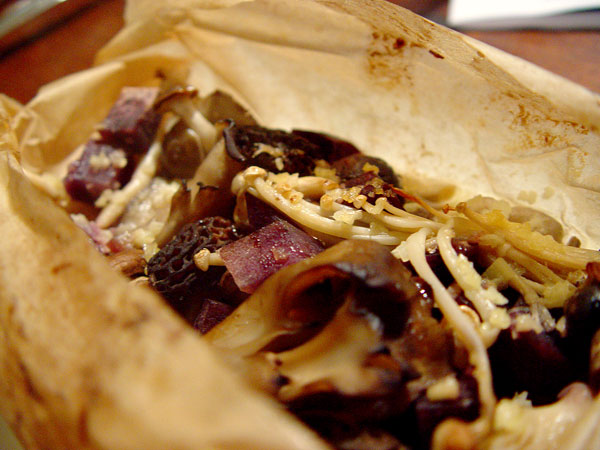 There are always some judges who are underwhelmed, but out of principle I try to make a practice of including one dish that treats the theme very, very simply and brings out its natural flavor as much as possible. In this case, I thought the ginger-sake butter treatment that I gave to some sweet potatoes a few months back would be brilliant with mushrooms as the star. So we tracked down a horde of mushroom varieties and made it something of a mélange with sweet potato as a supporting flavor. We included shiitake, oyster, hen of the woods, royal trumpet, crimini, enoki, white clamshell, beech and morel mushrooms, then went with a milder Hawaiian sweet potato so as not to overshadow the 'shrooms, and cooked them en papillote to lock in as much mushroomy goodness as possible. It didn't score as well as I thought it would. I didn't hear the comments, so I can only presume it was the typical "not enough going on" that I often get with this type of dish, but no matter. I thought it turned out great.