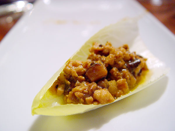 We toyed with making our first a pair of amuses, but decided to stick with just the stronger of the two. Originally conceived as a pair of mushroom / foie gras concoctions, one cold and sweet and the other hot and spicy (the first was to be a chilled foie and morel terrine with a grape granita), this was the latter of the two. I wanted a potent, unconventional start, so we paired the shiitakes with a milder meat, the foie for richness, the jicama for texture, and a very simple sauce of soy, curry and a touch of honey. I wasn't as thrilled with the execution as I was with the concept -- I committed the cardinal sin of throwing more meat in the wok than our home range could really handle properly -- but the crowd seemed to love it.