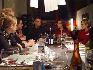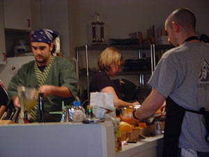 Anyway, that bit of navel-gazing aside, this past Saturday marked our tenth event, and it was a great one. My good friend and challenger from the inaugural competition finally came out of his self-imposed retirement to challenge once again, and we returned to the original event's site as well. And if the nostalgia factor weren't enough, faithful sous Kirsten and I managed to up our record to 8-2 despite losing two primary ingredients to unexpected spoilage at the last moment. Hopefully I'll get some recipes worked out over the next couple of weeks, but in the interim, here are some photos and descriptions of our dishes. Images of this Iron Chef are courtesy of my sister, Amanda Magnano, on whose behalf I'll make the excuse that her camera was malfunctioning all evening.