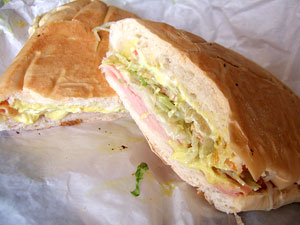 I have to say, Florida Bakery's Cuban was the lone miss of the day. The bread was the doughier Miami style, which wasn't doing it for me. I don't know if it's a function of the bread itself or this particular roll, but I find the Tampa-style bread much more compelling. And beyond the difference in bread, it was practically swimming in mayo and also included lettuce and tomato. Though I didn't know it at the time, Florida bakery serves what is known as a Super, which has somehow grown out of the traditional Cuban. I'm told this isn't a matter of catering to the gringos. Apparently they're quite popular among Cuban expats. But even if this variant has been embraced by the community that created the original, I think it defeats the purpose. The mayo and fresh vegetables disrupt the harmony that make a Cuban such a great sandwich. Sticking to the original is, in my limited experience, addition by subtraction.